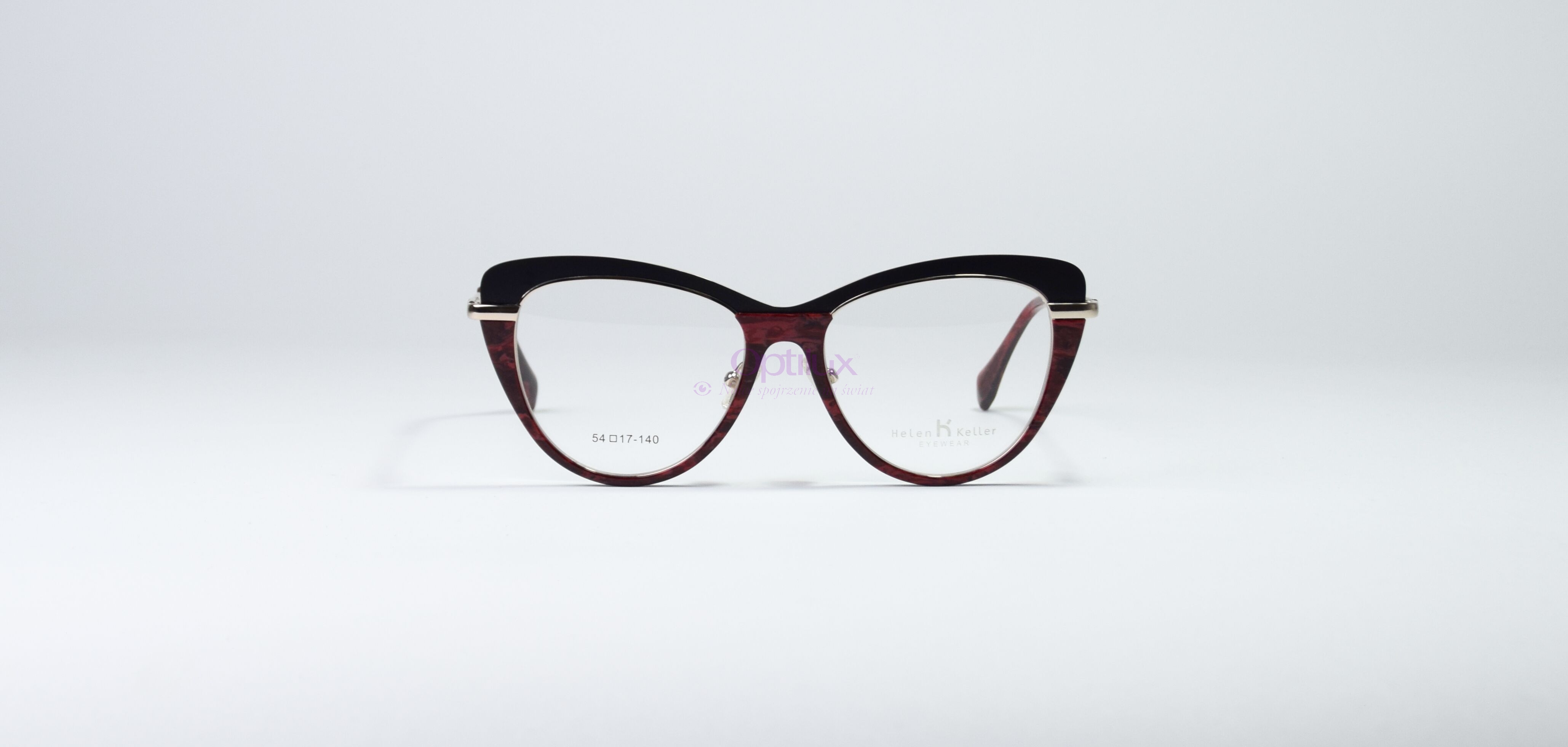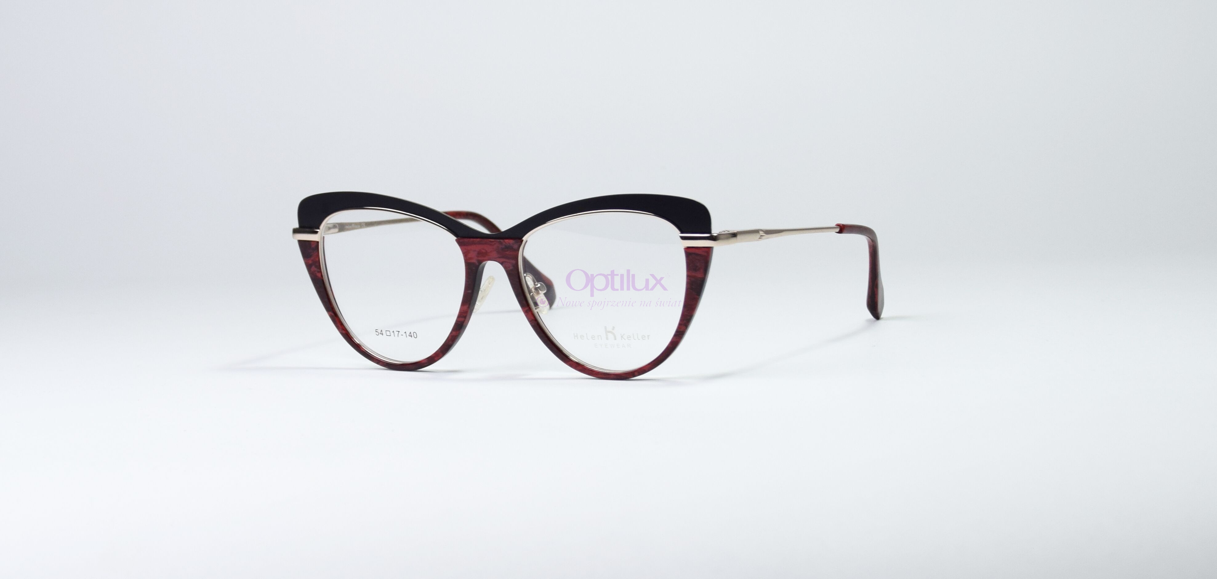 Zmysłowa elegancja i nowoczesna forma – oto cechy, które wyróżniają ten model oprawek Helen Keller. Inspirowana klasycznym kocim okiem, ta oprawka zachwyca subtelnym połączeniem kolorów: głębokiej czerni w górnej części frontu oraz bordowego marmurkowego wzoru w dolnej części ramki. Ten kontrast nadaje jej wyrazistego charakteru, idealnego dla kobiet, które lubią się wyróżniać z klasą.