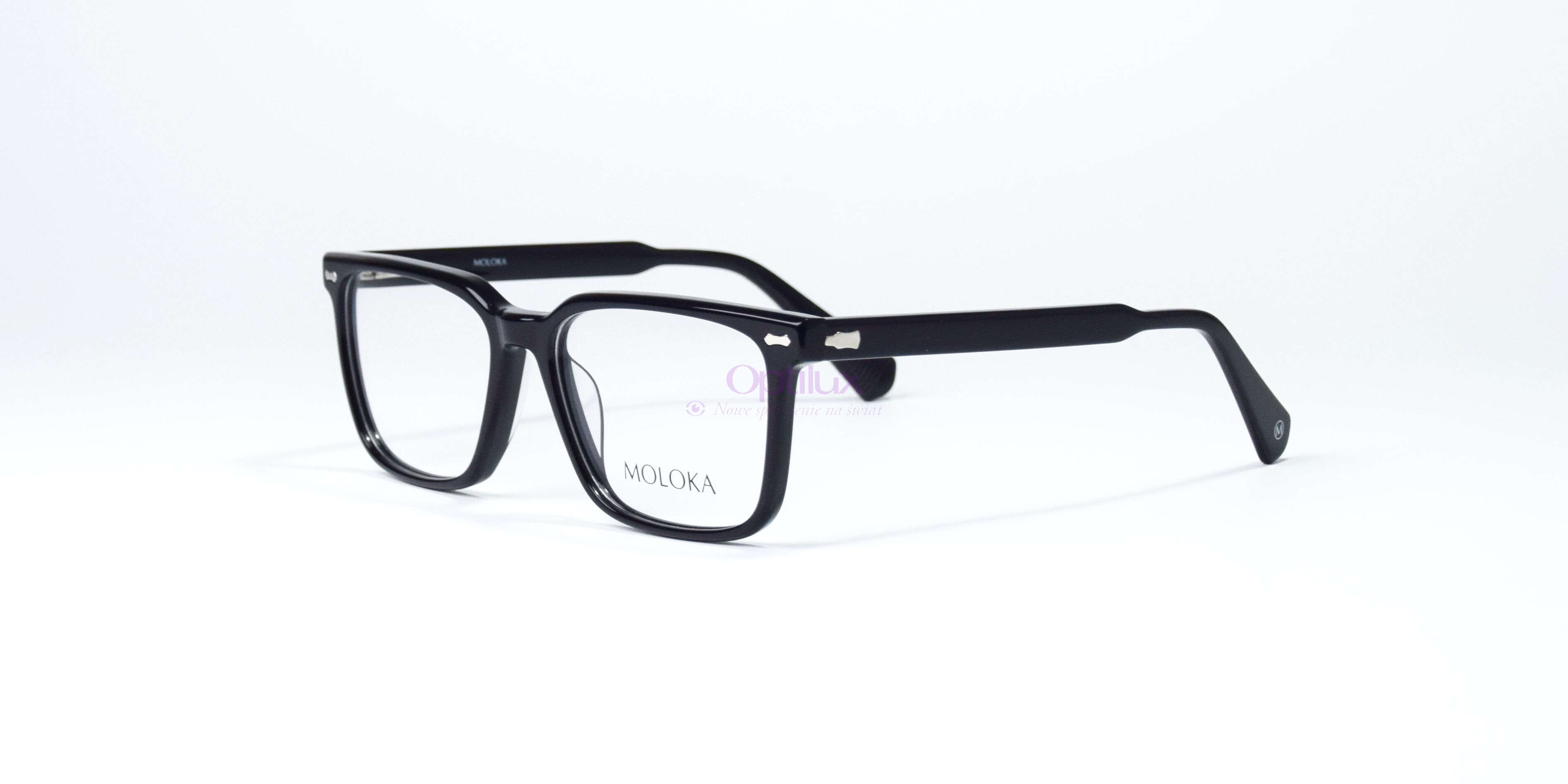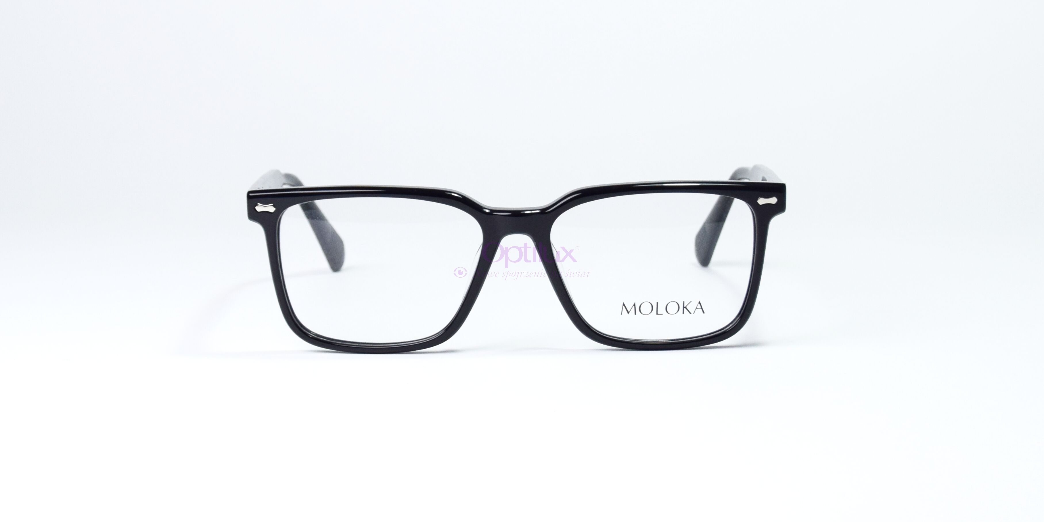 Model Moloka to pełna oprawa wykonana z trwałego, lekkiego tworzywa sztucznego w kolorze czarnym. Klasyczny, prostokątny kształt frontu zapewnia uniwersalne dopasowanie do większości typów twarzy. Na zausznikach znajdują się minimalistyczne metalowe detale w kolorze srebrnym, które pełnią zarówno funkcję estetyczną, jak i wzmacniającą.