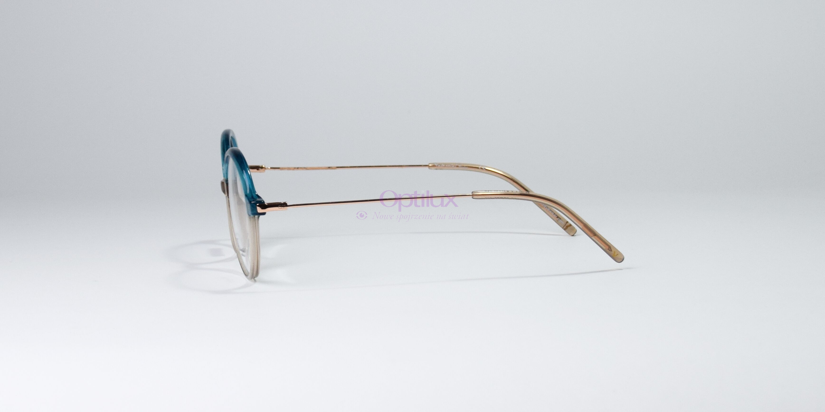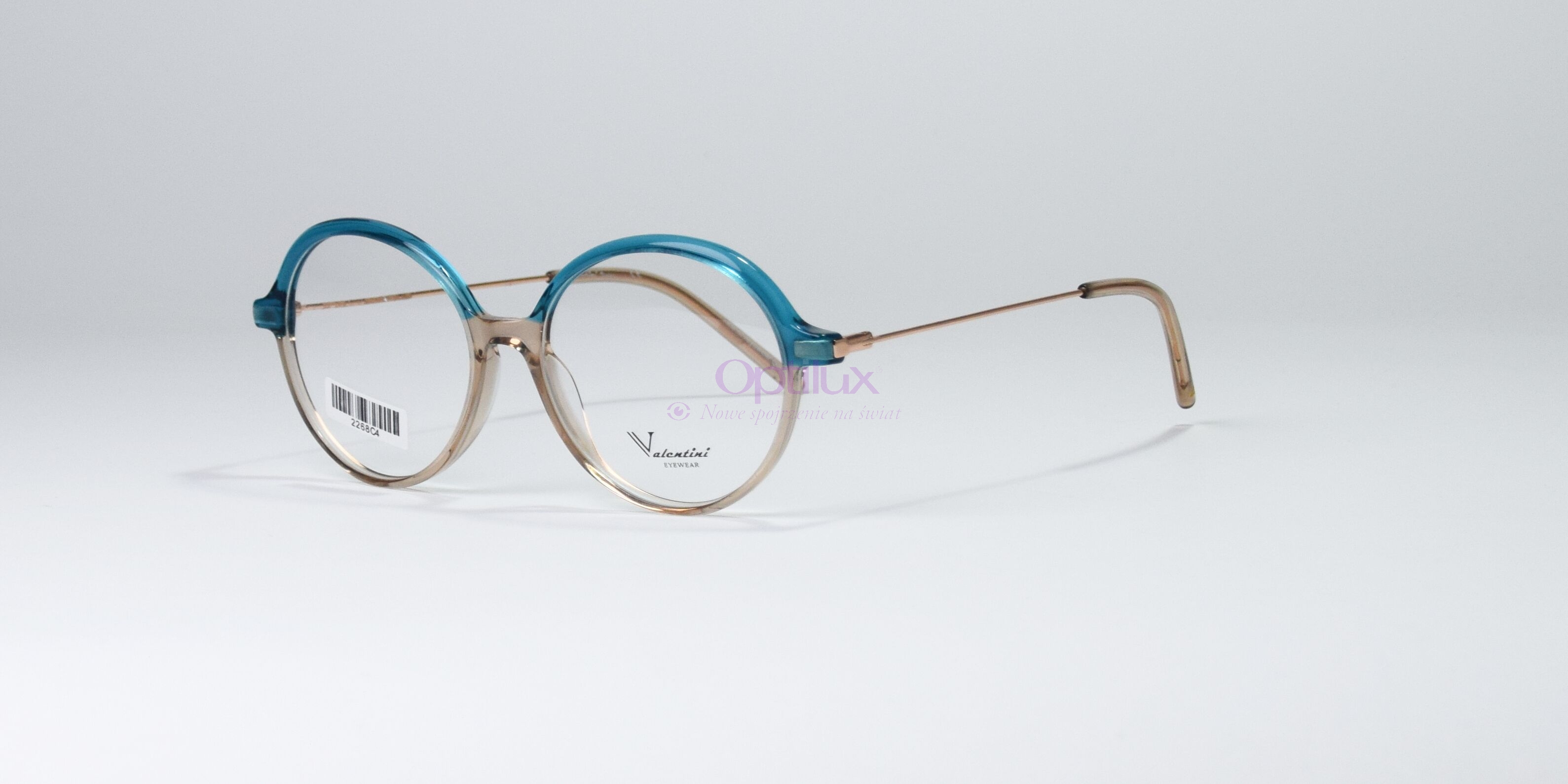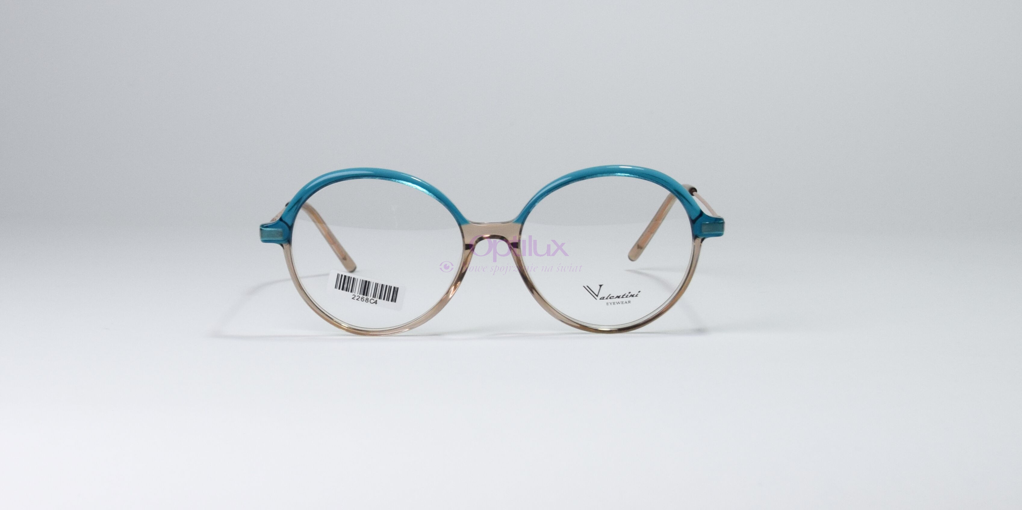 Wyróżnij się z tłumu dzięki unikalnej oprawie Valentini 2268, która łączy klasyczną formę z odważnym kolorem. Górna część frontu w intensywnym turkusie dodaje charakteru, a przejrzysty beż w dolnej części sprawia, że całość pozostaje lekka i subtelna. Złote, cienkie zauszniki podkreślają elegancję oprawy.